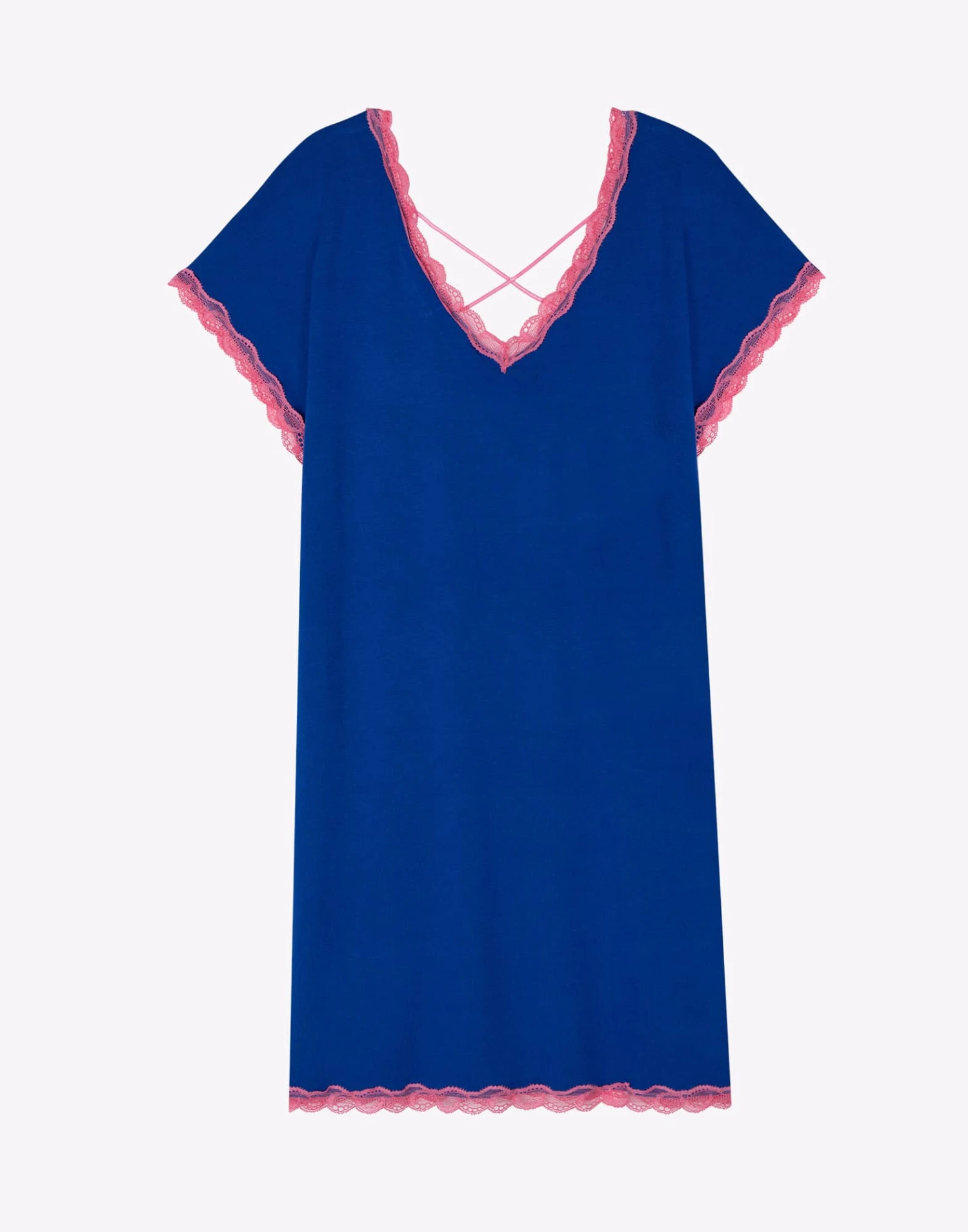De fines brides satinées se croisent dans le dos pour une touche graphique, tandis que les manches courtes et bas de la chemise de nuit s’habillent de la même dentelle contrastée.