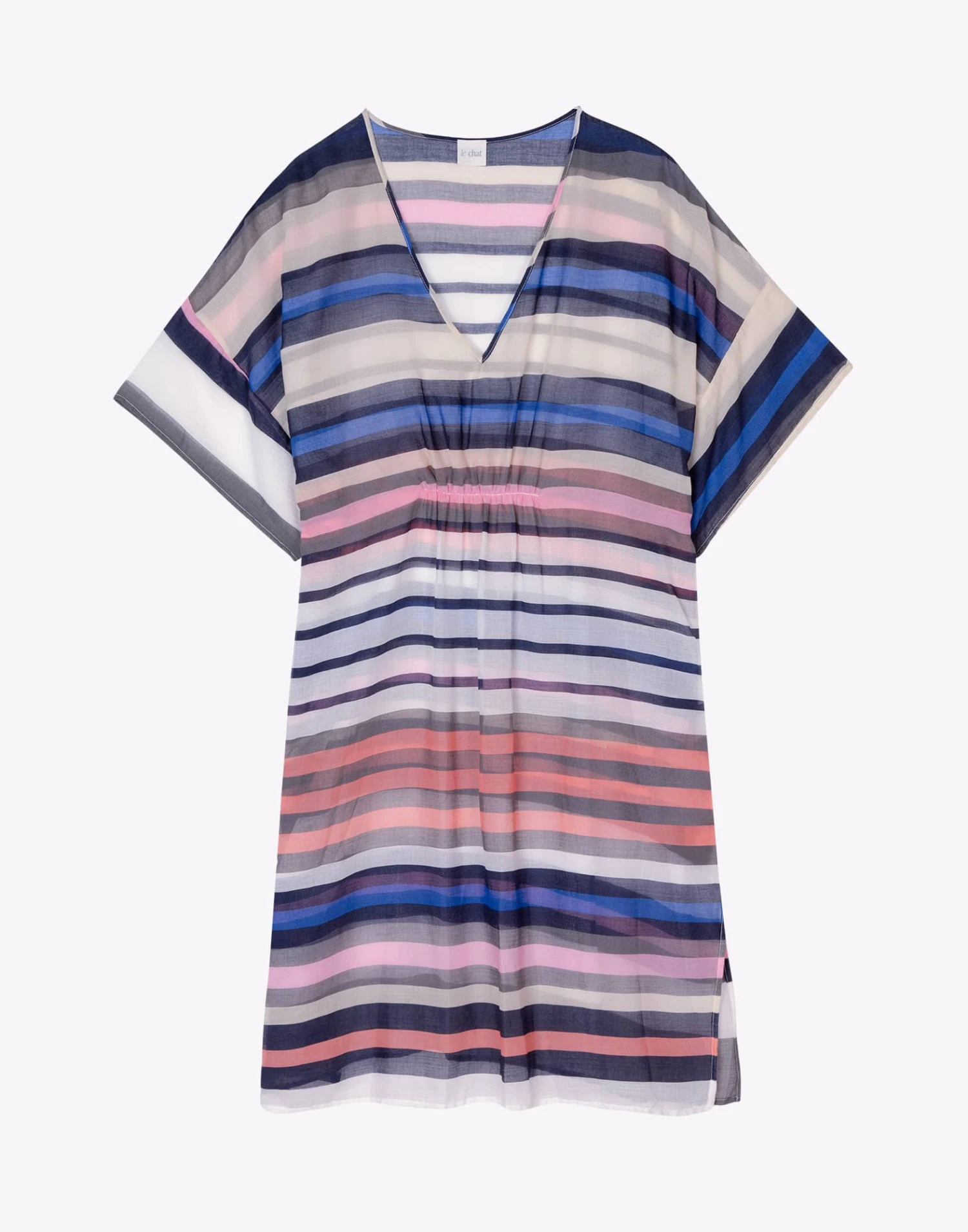 Sur un voile de coton au toucher tout doux et à l’effet crinkle, légèrement texturé et facile à entretenir, les rayures asymétriques et contrastées apportent juste ce qu’il faut de transparence aux kaftan VALLAURIS 940, robes VALLAURIS 941 et 942 et pantalon VALLAURIS 980 : vos must-haves légers et élégants de plage.
