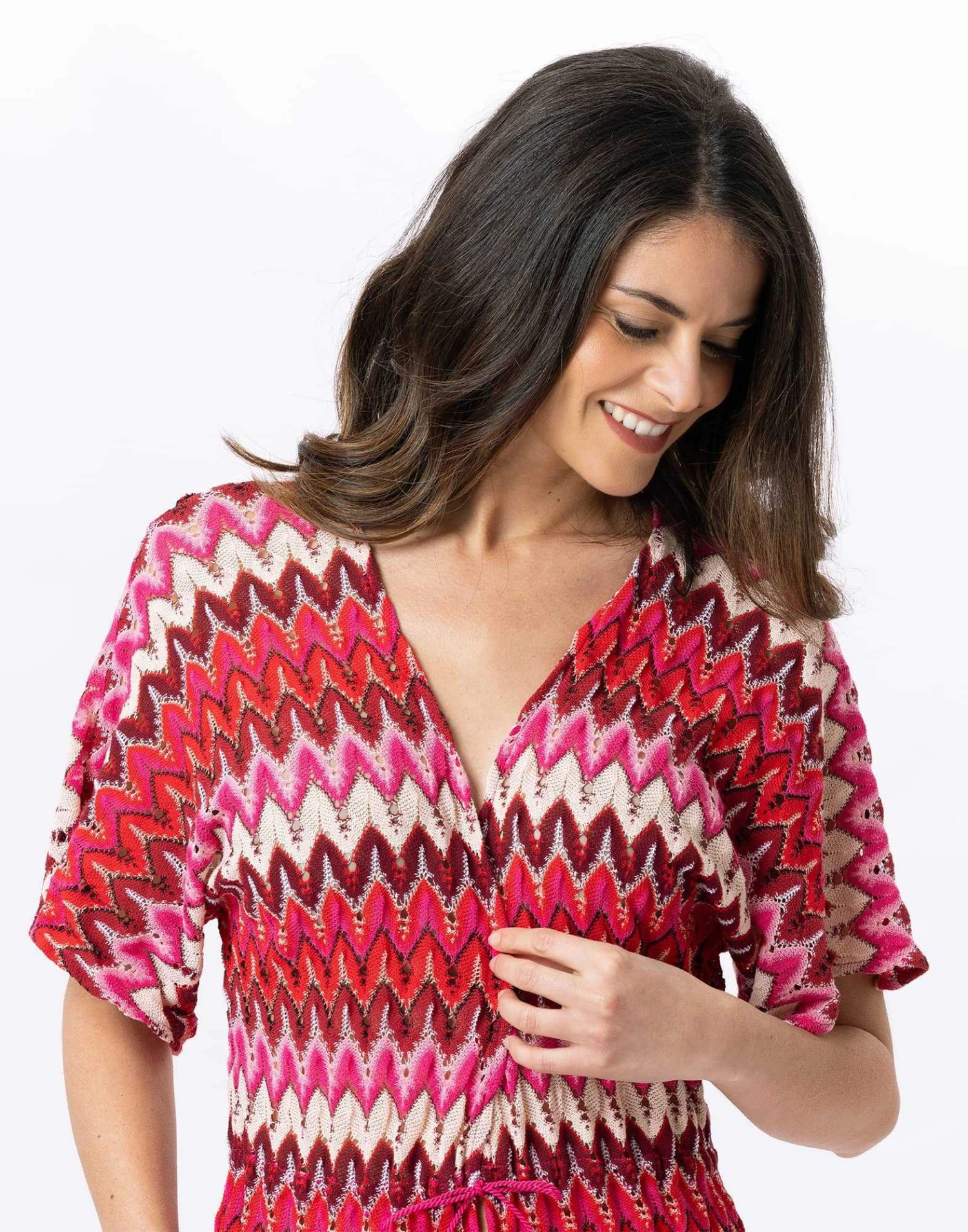 Salvador de Bahia : la ville aux multiples couleurs nous a inspirée pour cet été ! La maille fine zig zag régulier est multi couleurs, déclinée en deux variantes : l’une dans les tons roses, l’autre déclinant le bleu / kaki et gold. La maille ajourée donne juste ce qu’il faut en transparence aux vêtements légers et agréables à porter tout l’été.