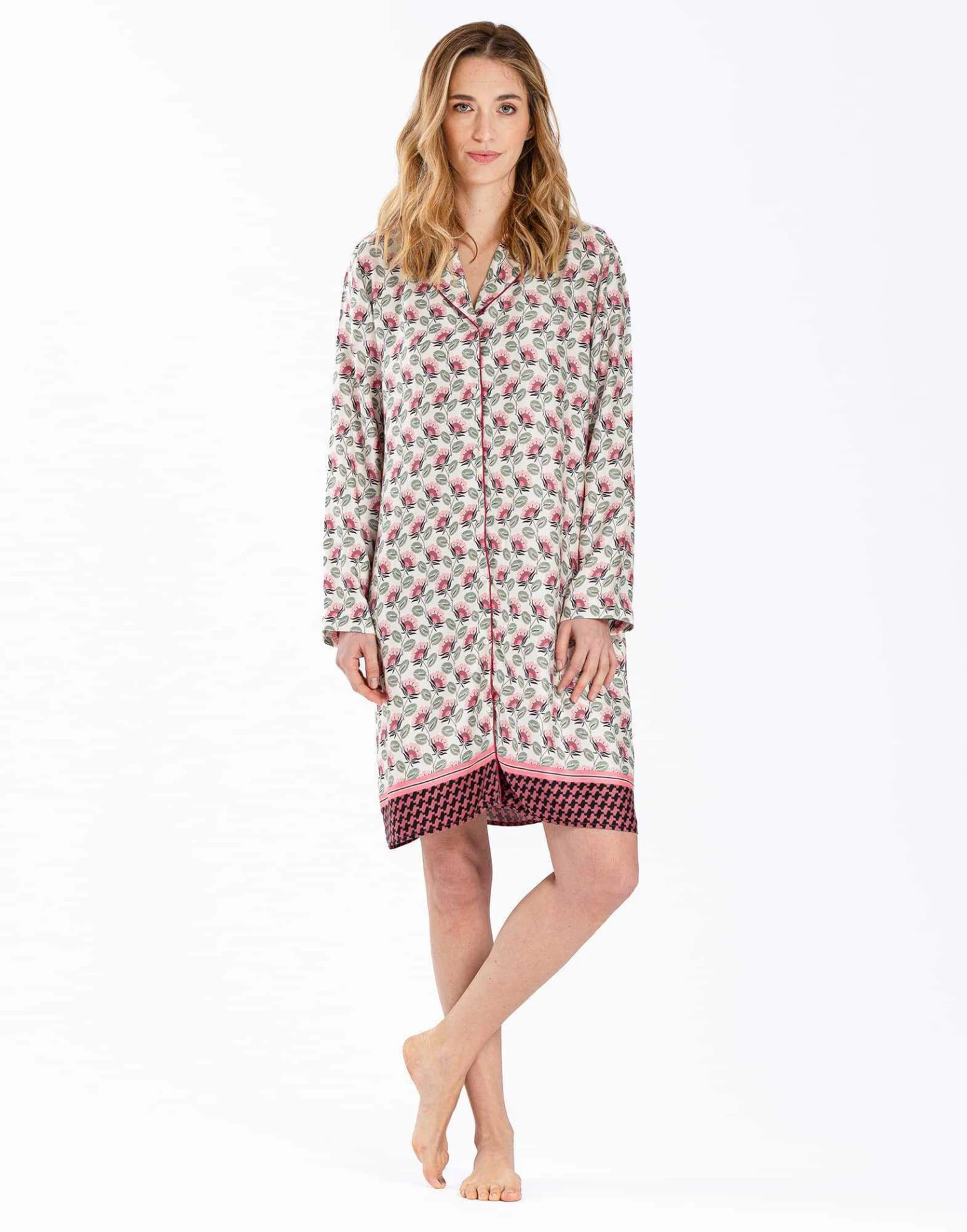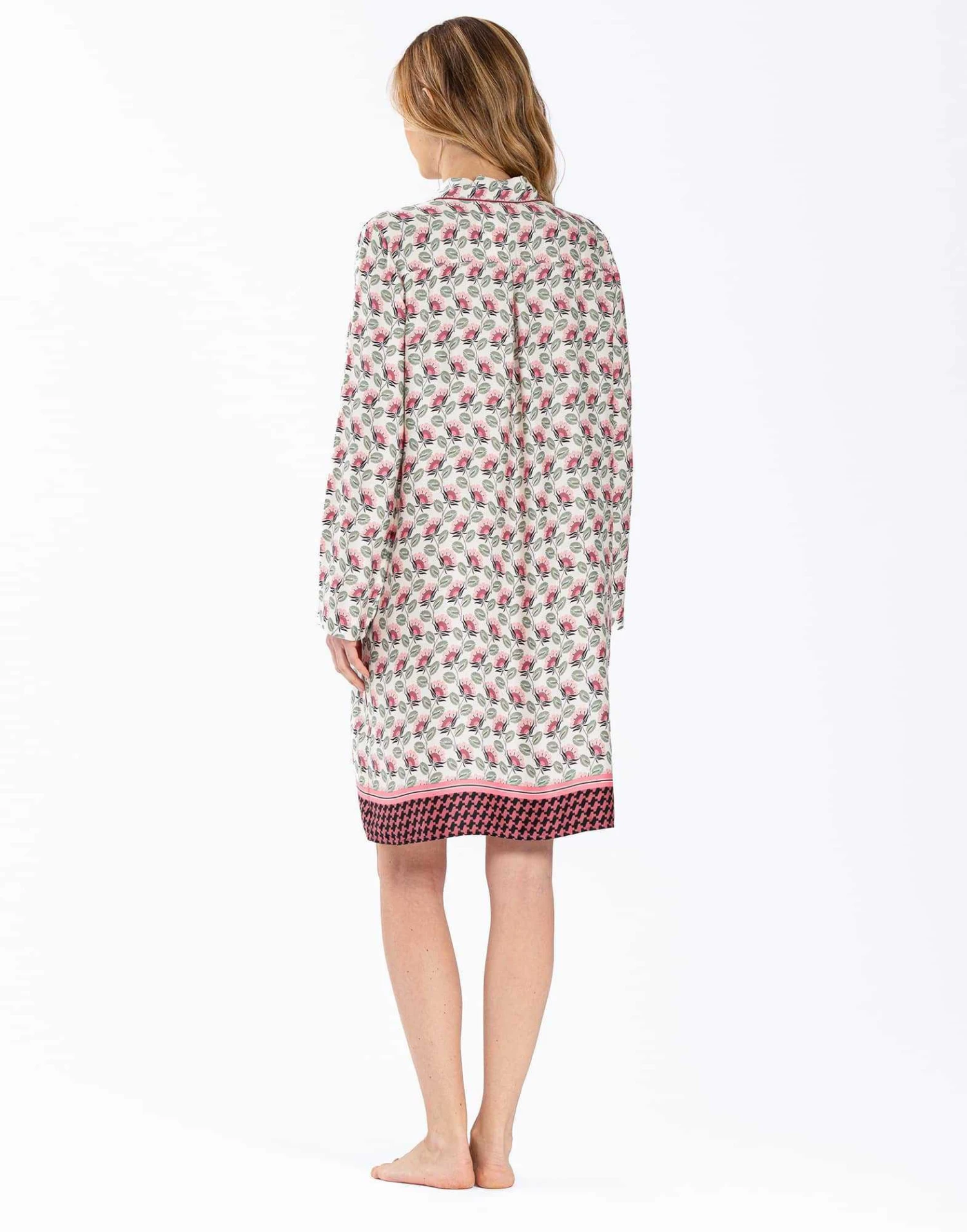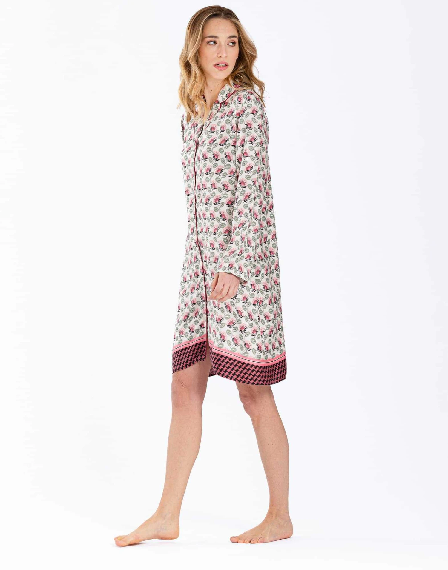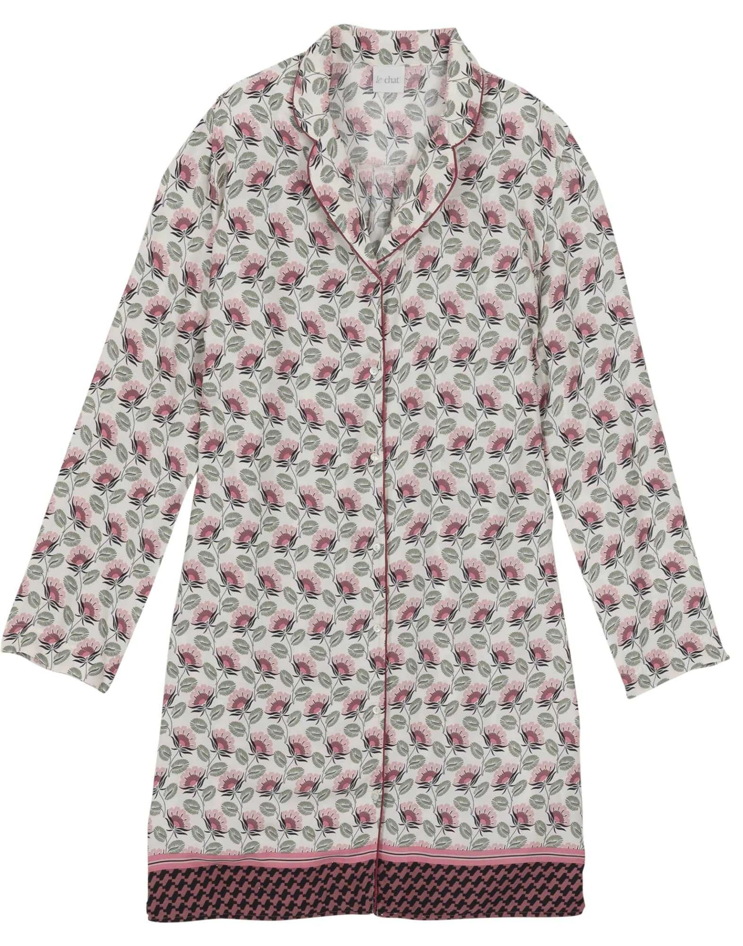 Ligne en jersey propose des pièces en chaine et trame 100% viscose et des pièces en maille. L’imprimé, motif fleur aux inspirations fleurs japonisantes et pied de poule aux inspirations scandinaves, est exclusif LE CHAT.