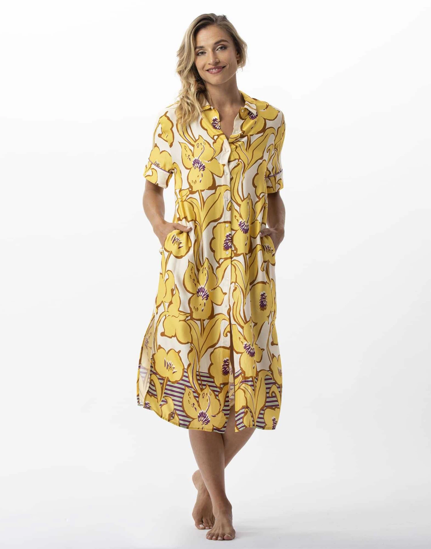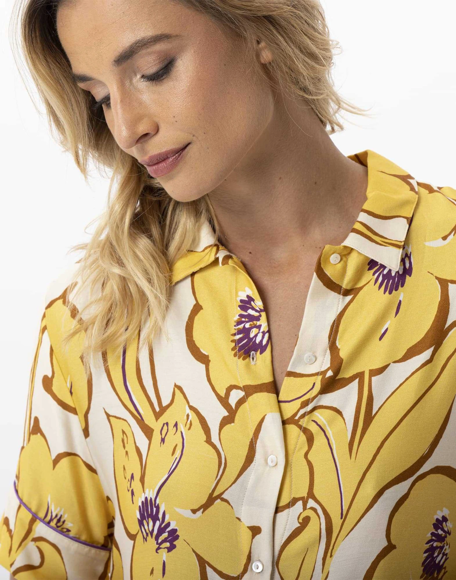 Confort et allure sont de mise ! Notre liquette longue vous habillera avec douceur et féminité pour être bien chez vous. Son imprimé floral, ses couleurs lumineuses et sa coupe fluide offrent aussi la possibilité de la porter de jour : une robe longue accessoirisée de sandales pour un look frais et printanier.
