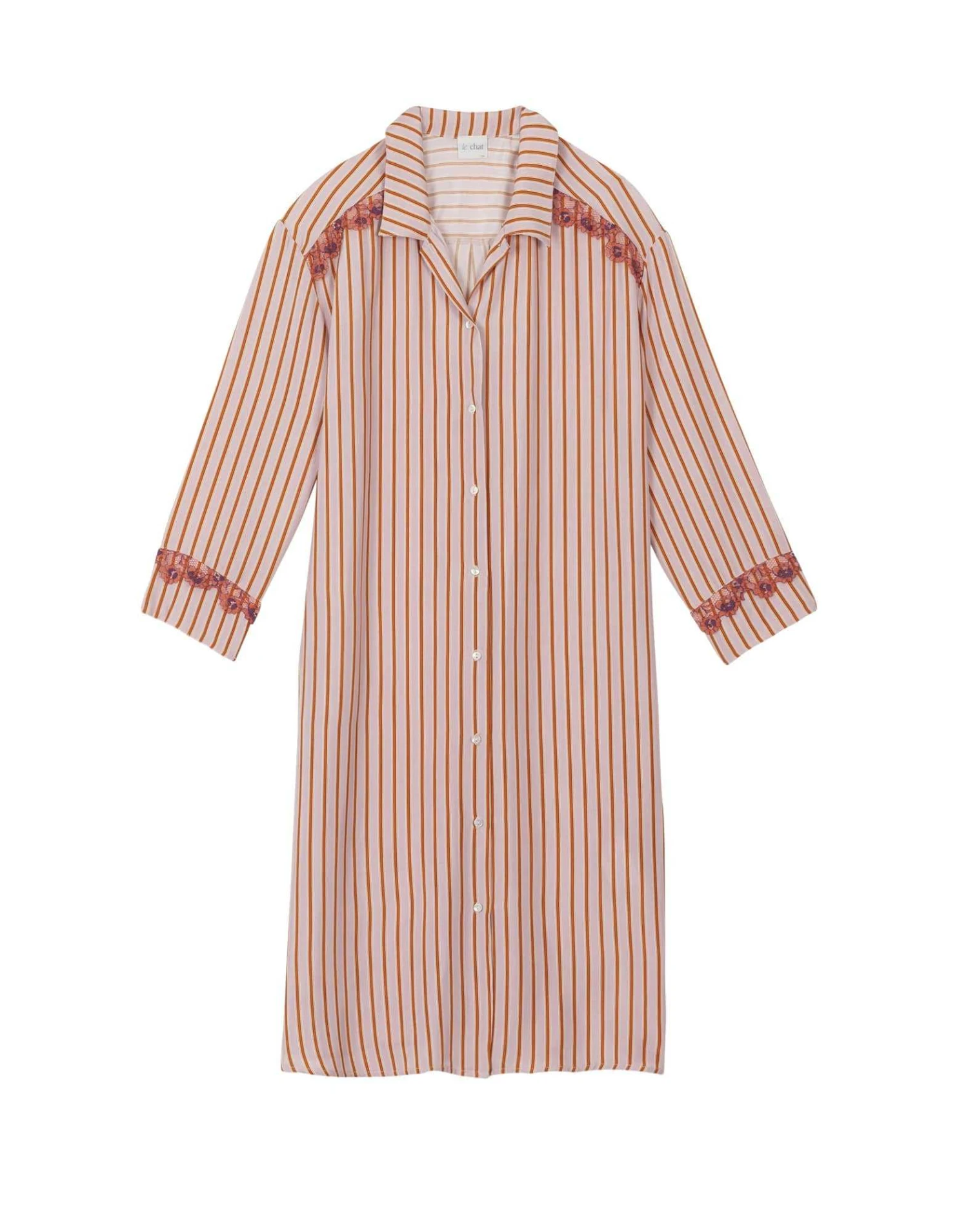 Nous l’avons développée dans une viscose présentant un toucher ultra frais sur la peau. Le twill de viscose est habillé d’une impression rayée, imprimé exclusif dessiné par nos soins. Dans une couleur aussi fraîche et douce que l’est la sensation de la matière : dragée.