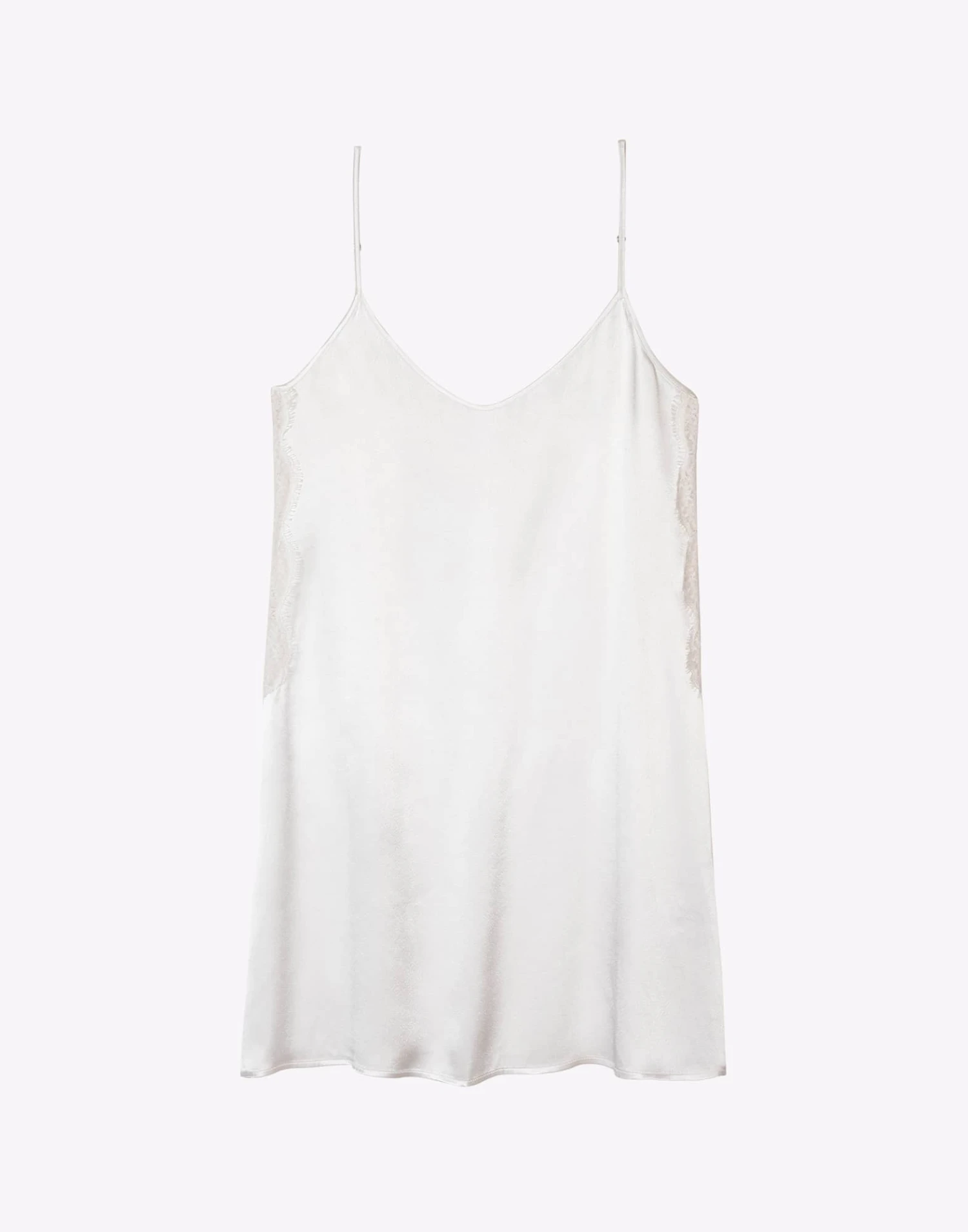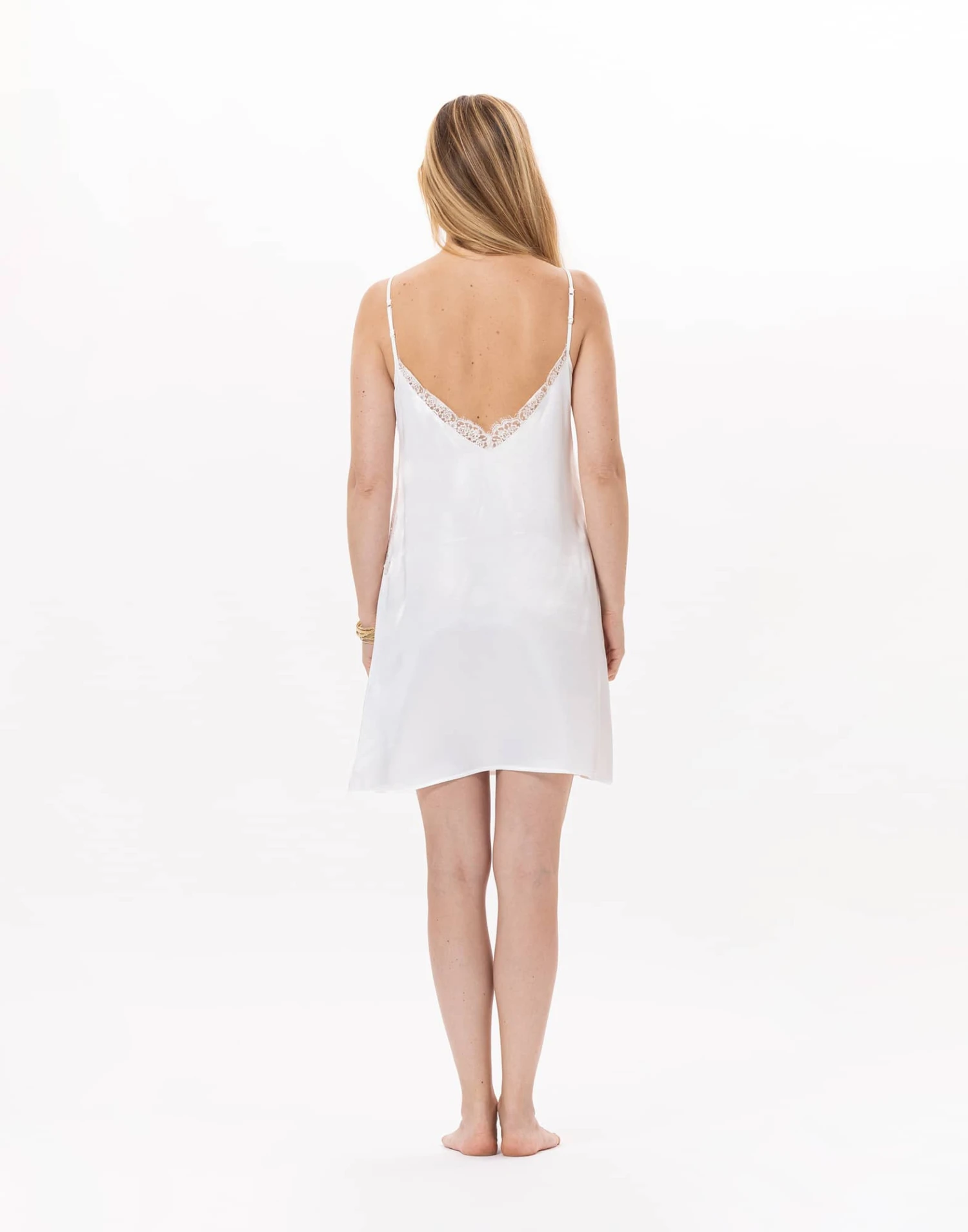Tombé plombant, matière fluide et confortable : nous avons développé notre ligne de lingerie de nuit CROISETTE dans un satin lourd blanc immaculé 100% viscose, avec un envers tout doux sur la peau.