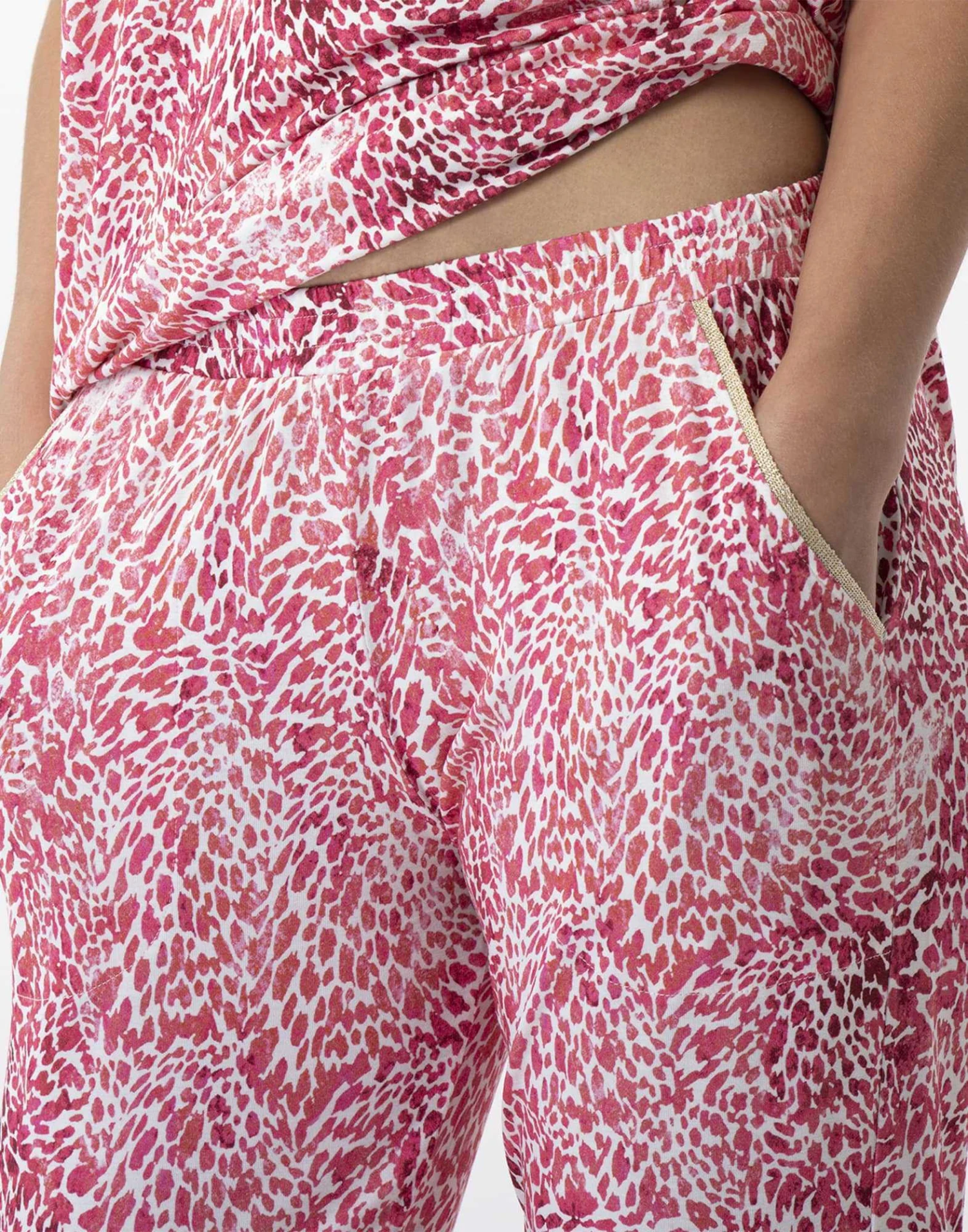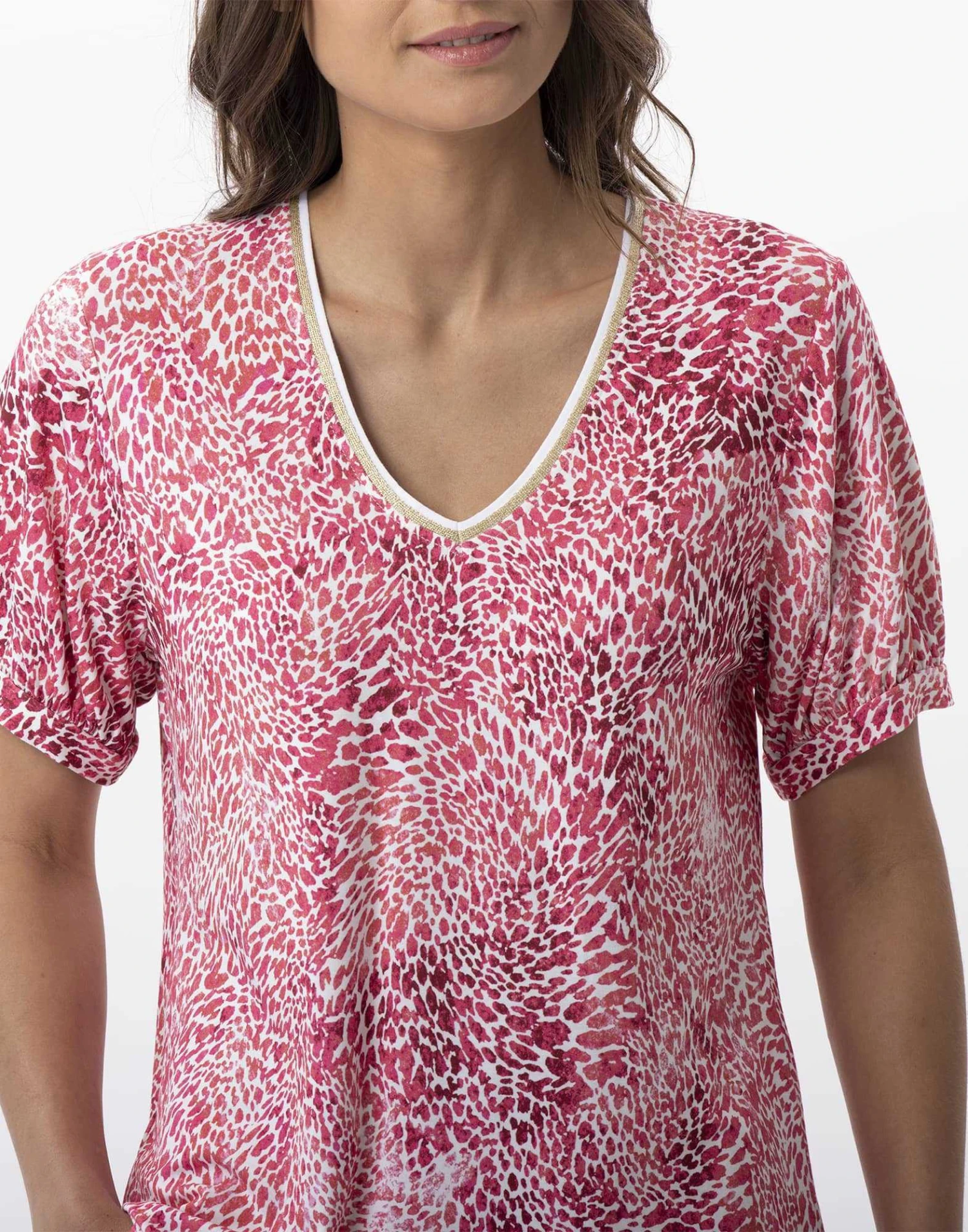 – Encolure V soulignée par un petit galon en tricot lurex coordonné à l’imprimé