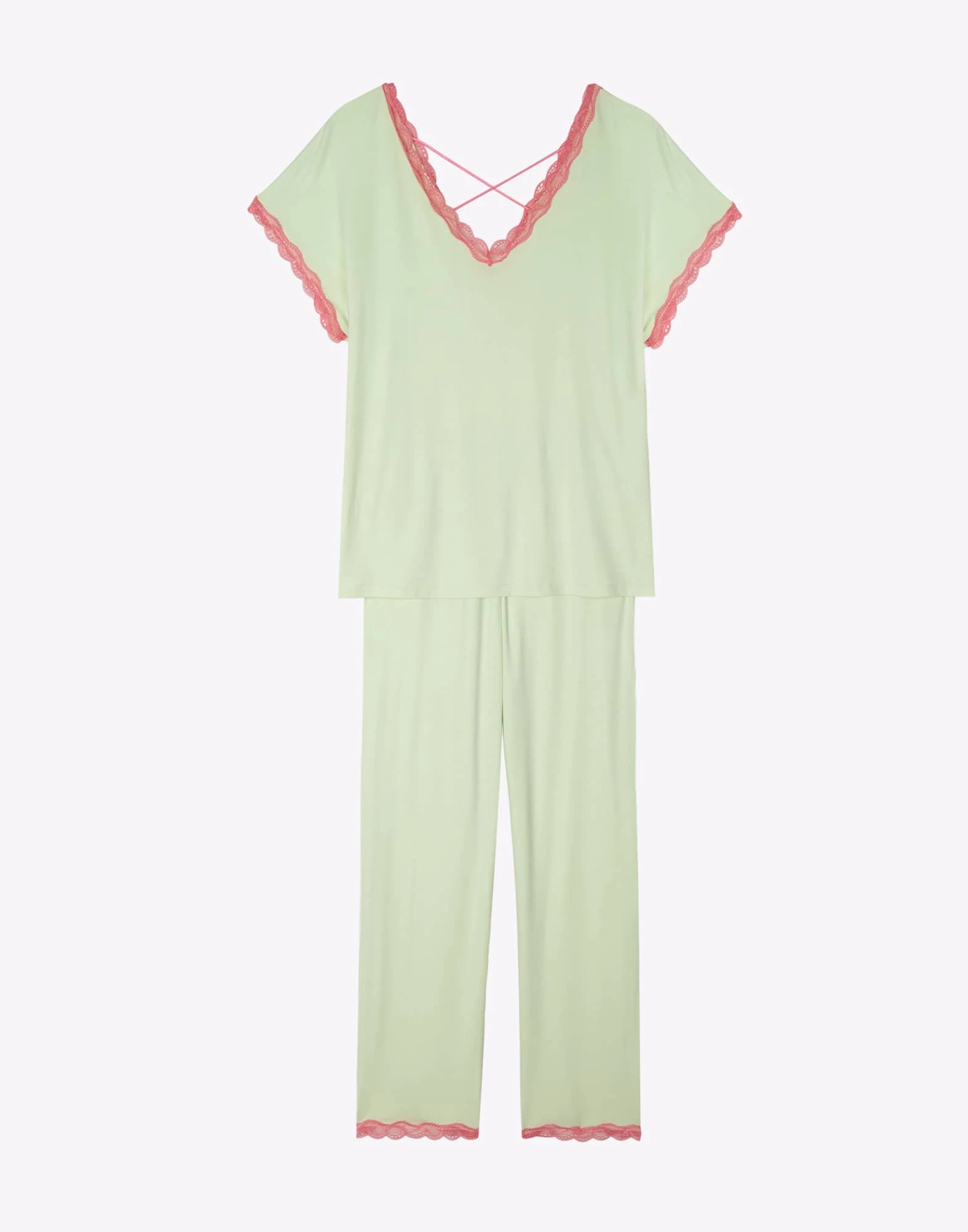 De fines brides satinées se croisent dans le dos pour une touche graphique, tandis que les manches courtes et bas jambes s’habillent de la même dentelle contrastée.