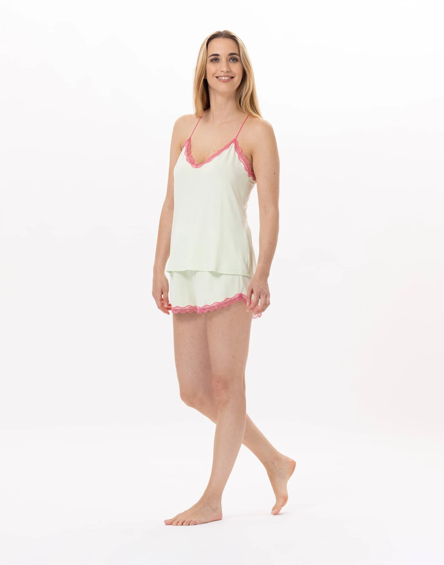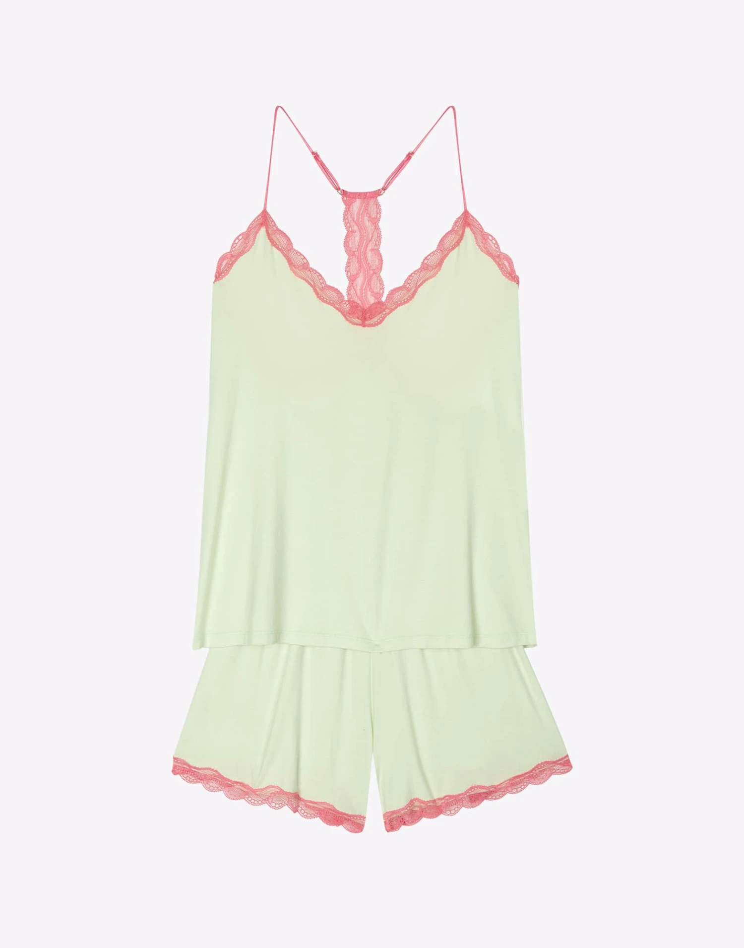 – Galons de dentelle Made in France soigneusement posés sur le jersey au décolleté et au dos du top, ainsi qu’en bas de jambes du short