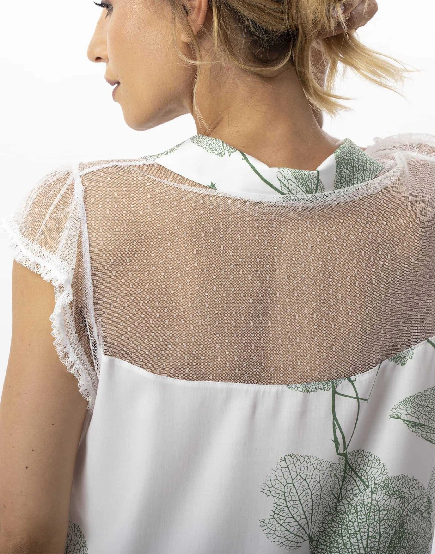 Les 5 modèles du thème GINKGO sont tous certifiés OEKO-TEX® STANDARD 100. Le pyjama short 700, la nuisette 703 et le kimono 760 sont animés par des jeux de dentelle en laize 100% Made in France : un petit plumetis sur résille.