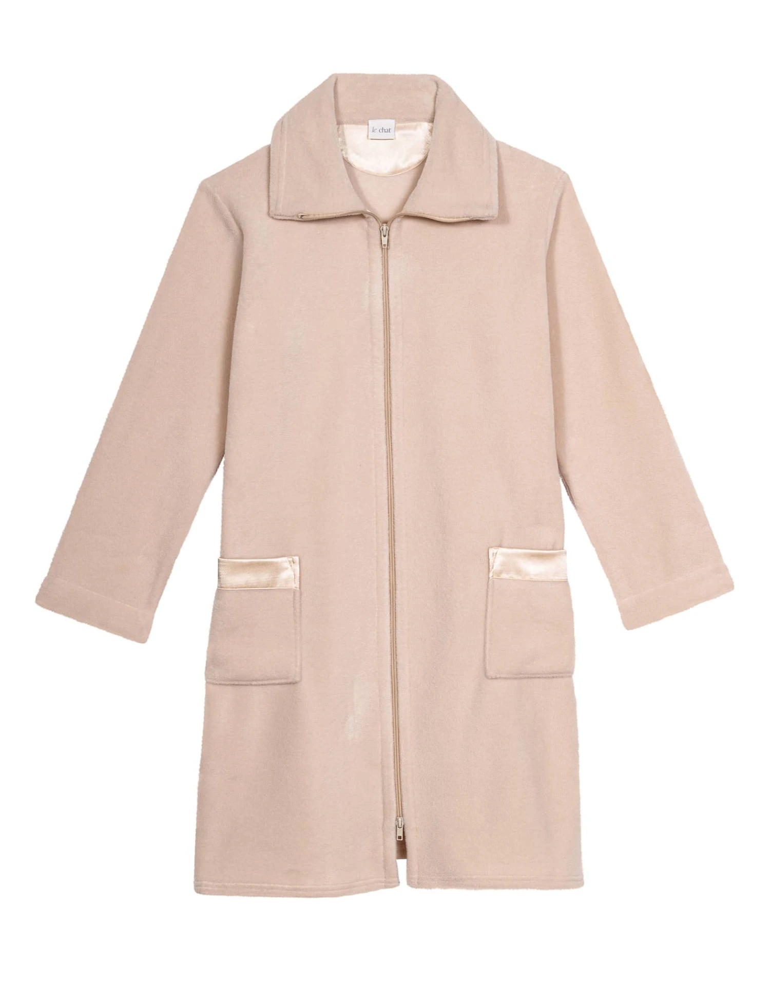Une robe de chambre zippée, longueur 95cm, coupe droite, en polaire marine 100% polyester. Deux larges poches plaquées rehaussées par une application de satin marine en haut de poche. L’indispensable de l’hiver.
