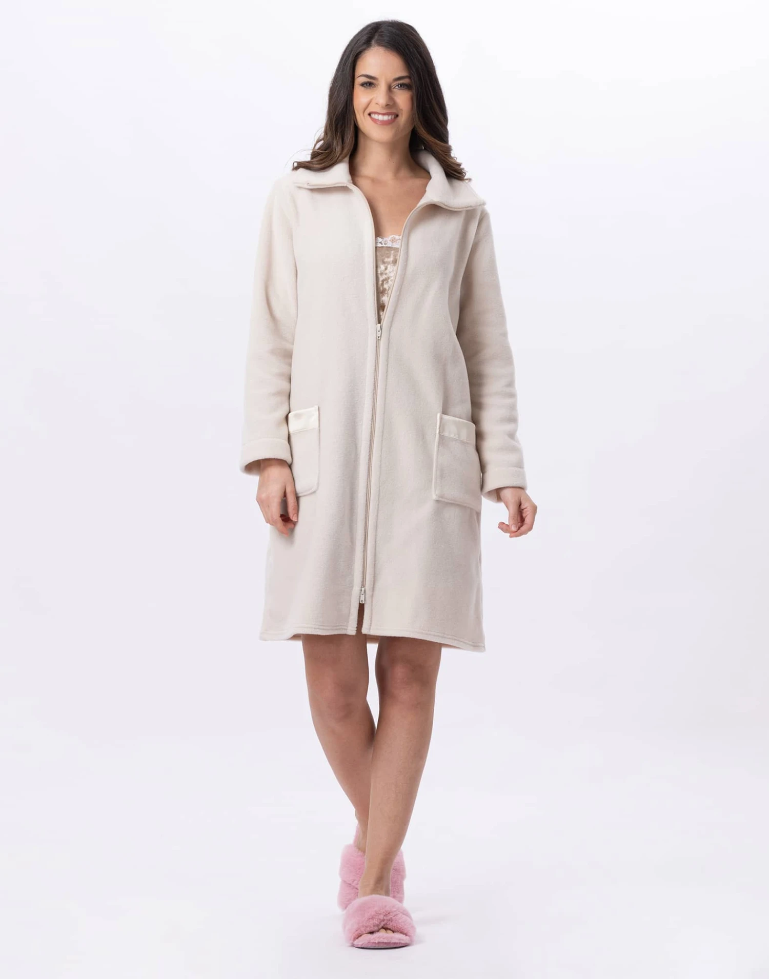 L’indispensable robe de chambre revisitée en maille polaire , pour que l’hiver se passe toujours bien au chaud.