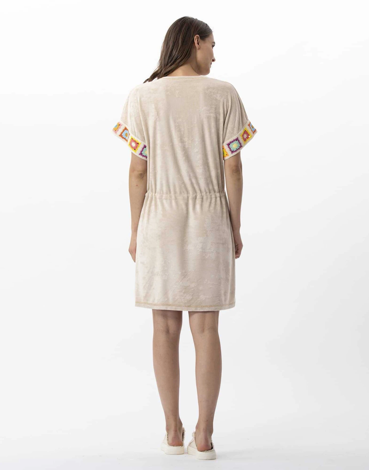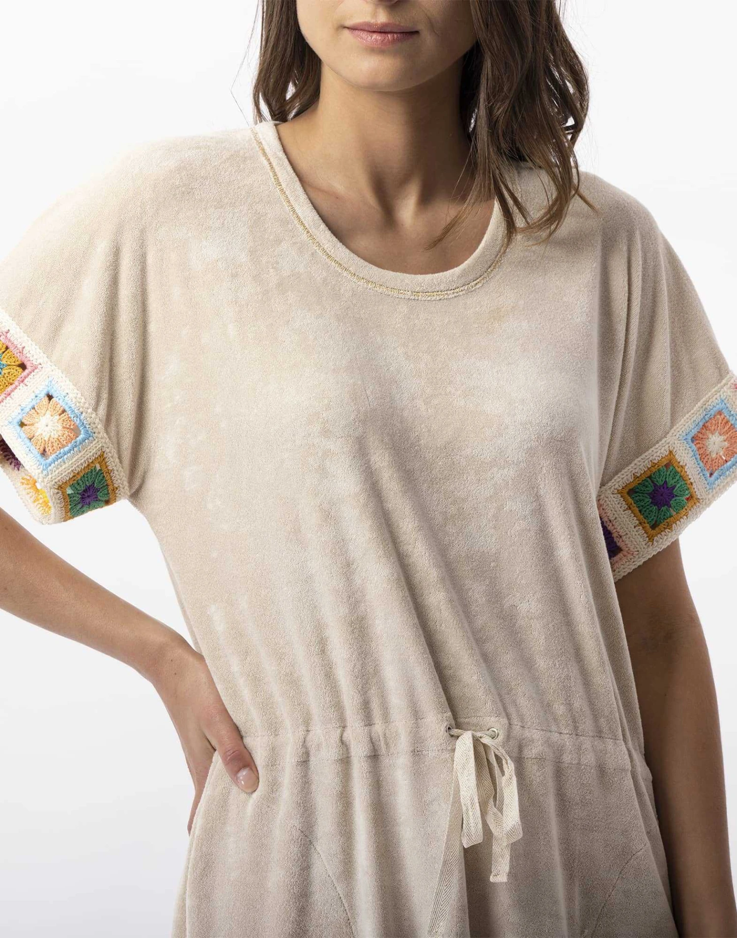 – Encolure ronde et bas de la robe animée par une couture flatlock