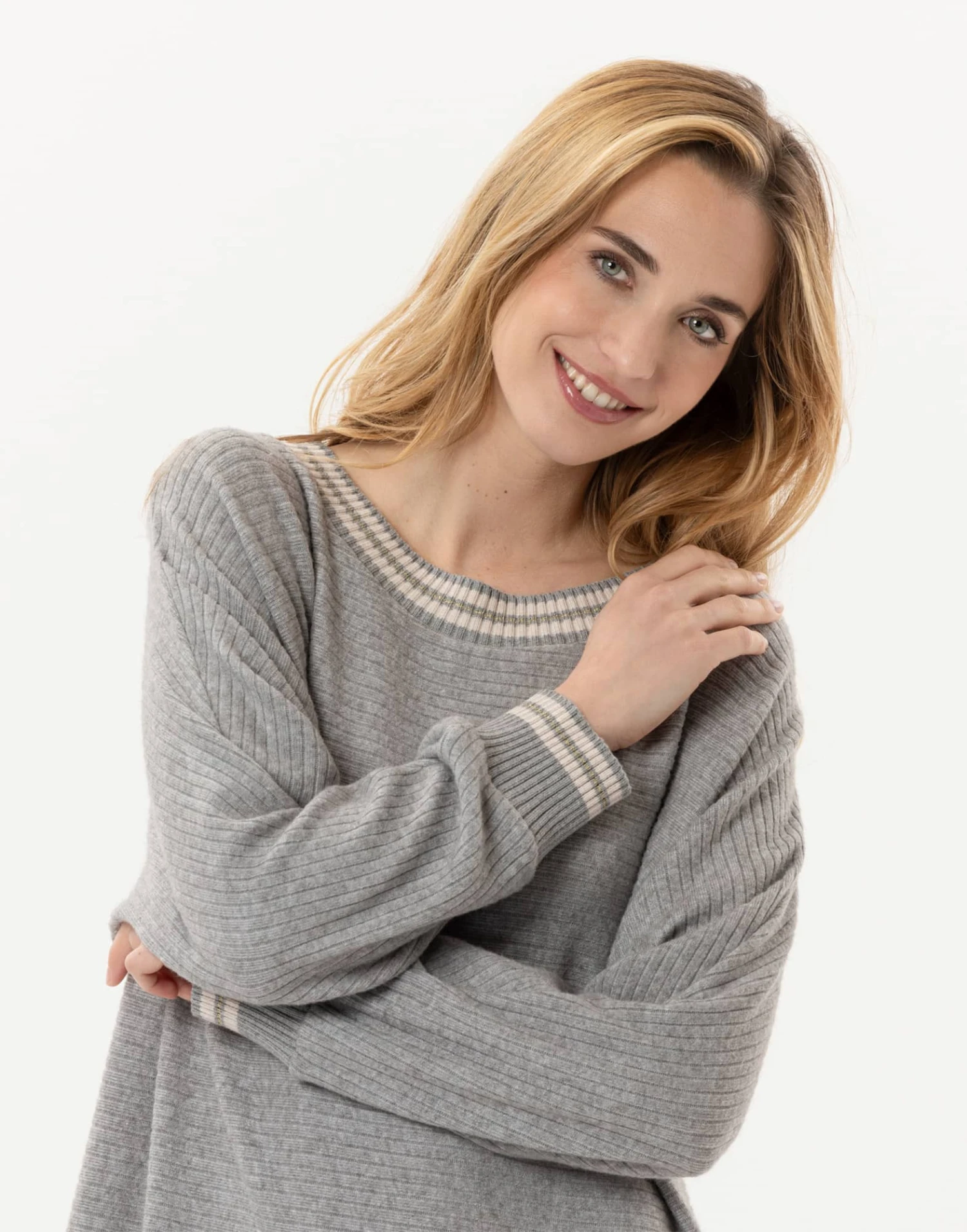 – Encolure soulignée par un bord côte coton polyamide 3 rayures avec détails de fils Lurex