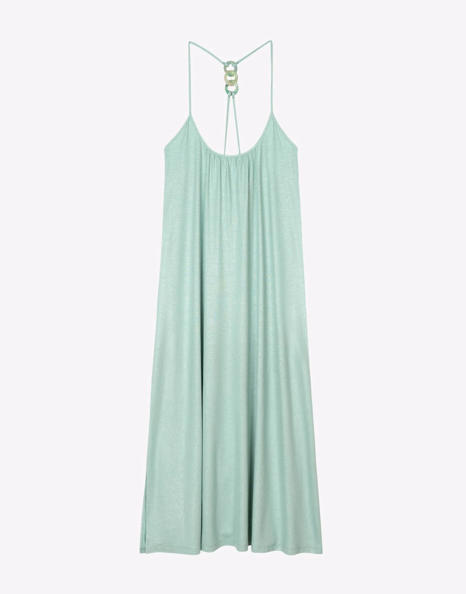 Ses fines bretelles dévoilent un dos nu ajustable grâce à des liens à coulisses, permettant de personnaliser la coupe, tandis que ses fentes latérales ajoutent une touche de fluidité.