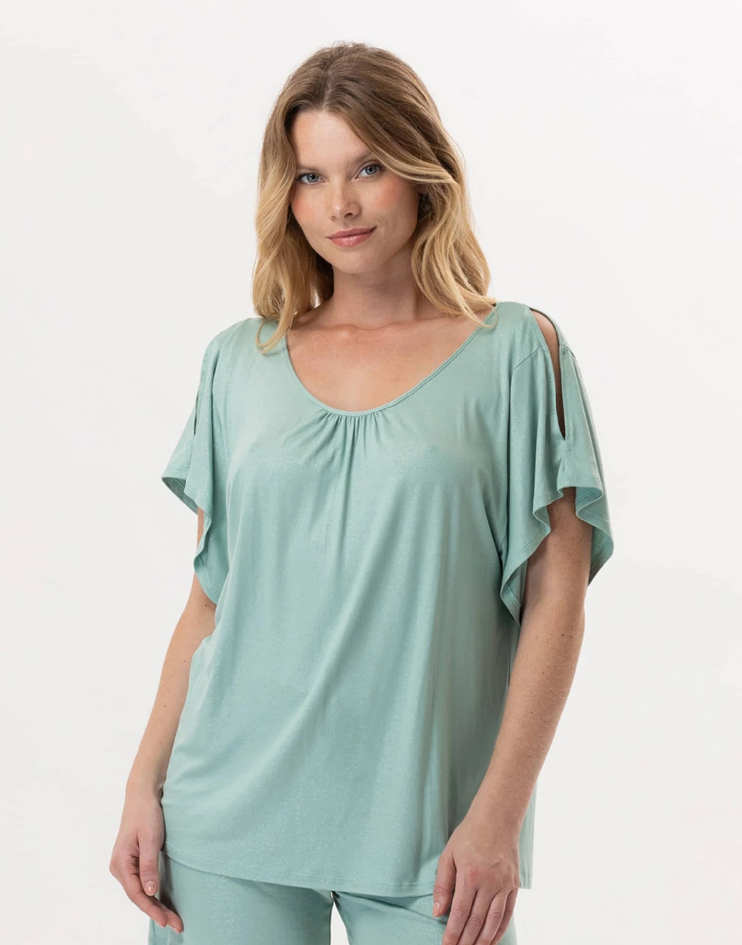 Son jersey viscose-élasthanne, sublimé de paillettes, allie douceur et facilité d’entretien. Décliné en vert d’eau rafraîchissant ou en sable apaisant, RAMATUELLE capte l’éclat de la mer et du soleil pour un été qui s’annonce brillant.